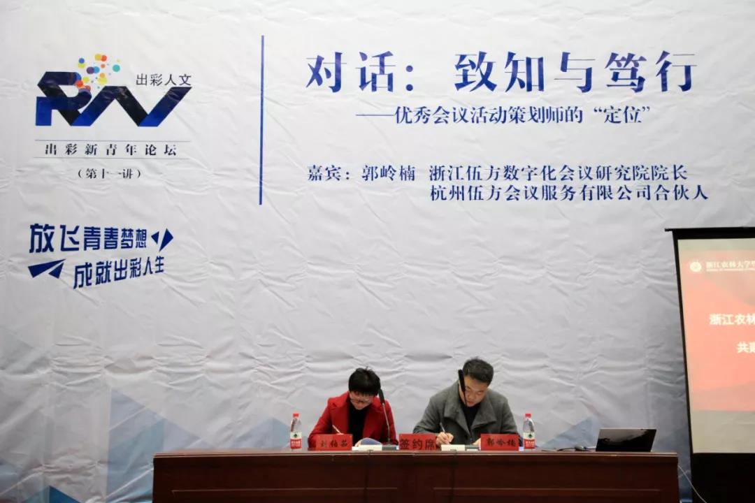 2019年12月11日,浙江伍方數(shù)字化會(huì)議研究院院長郭嶺楠受邀前往浙江農(nóng)林大學(xué)暨陽學(xué)院參加“對(duì)話:致知與篤行——優(yōu)秀會(huì)議活動(dòng)策劃師的‘定位’”新青年論壇。