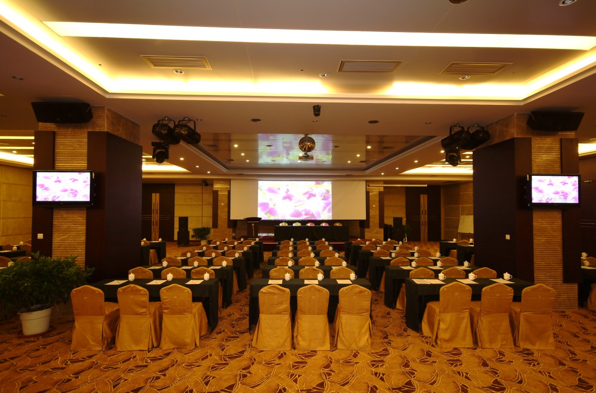在會(huì)議廳內(nèi)面向講臺(tái)擺放一排排座椅,中間留有較寬的過(guò)道。